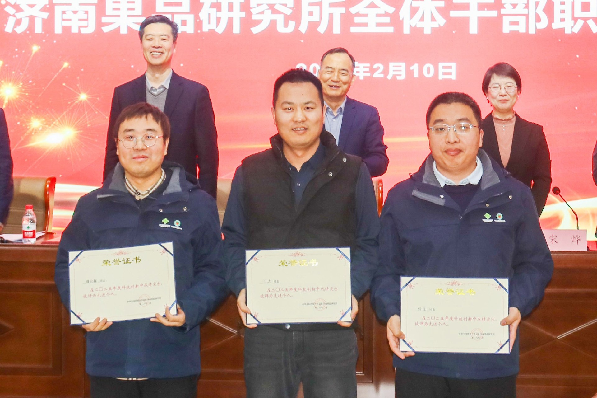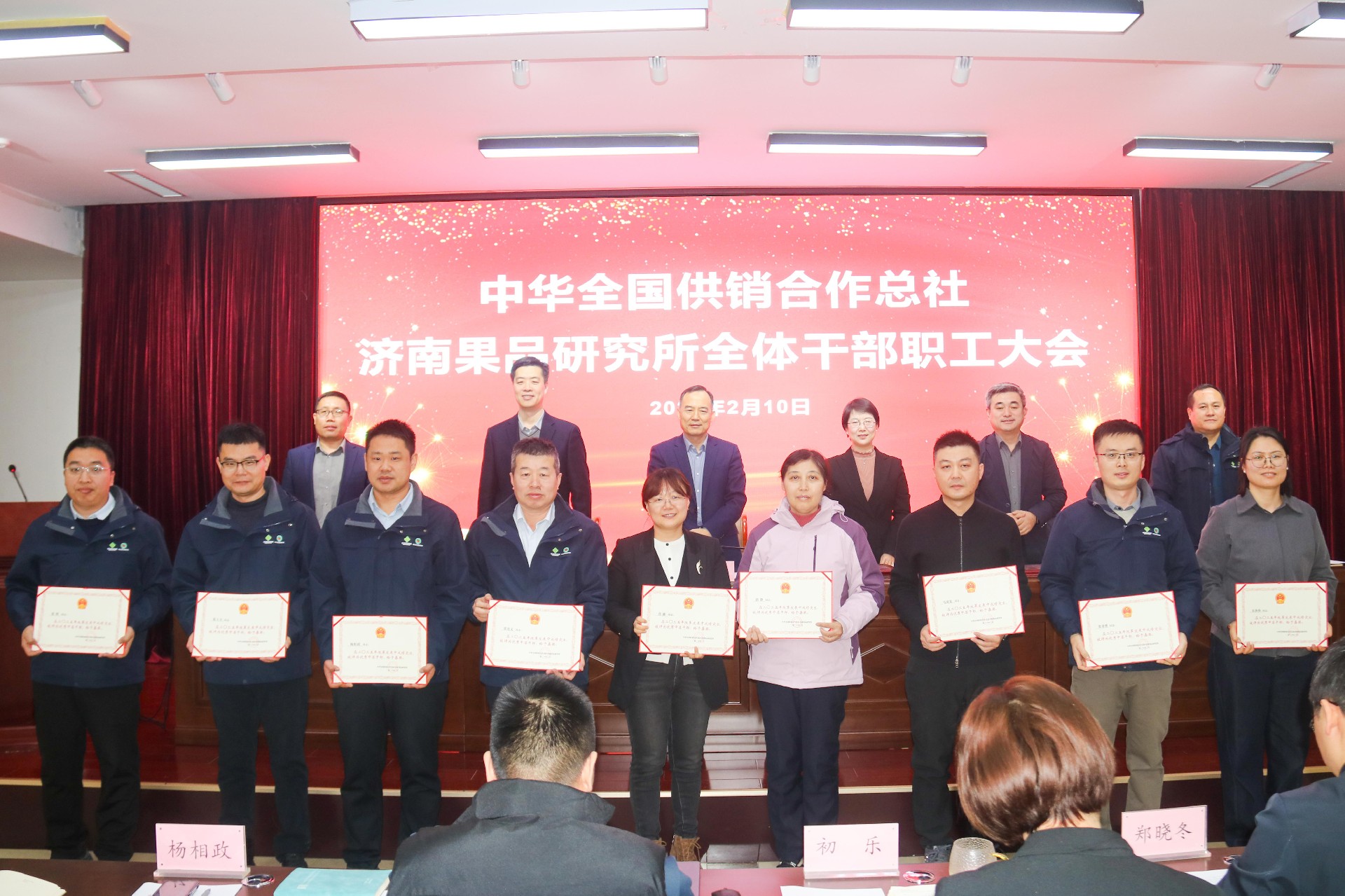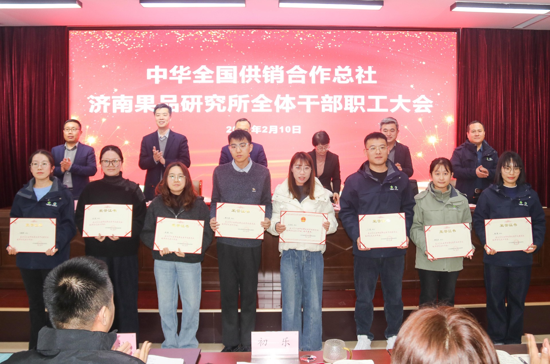 2月10日,中华全国供销合作总社济南果品研究所召开全体干部职工大会,回顾总结2025年度主要工作,部署2026年重点工作,表彰年度先进。所党委书记、所长吴茂玉出席会议并讲话。党委委员、副所长和法涛、赵岩,党委委员、功能食品研究中心主任马超,工会主席、财务处处长邓海锋出席会议。会议由党委副书记、纪委书记宋烨主持。